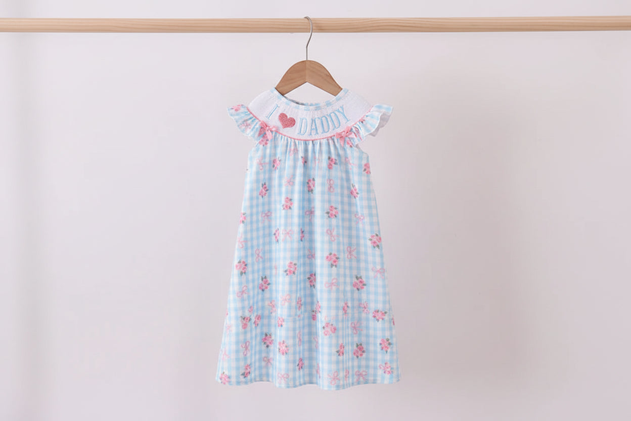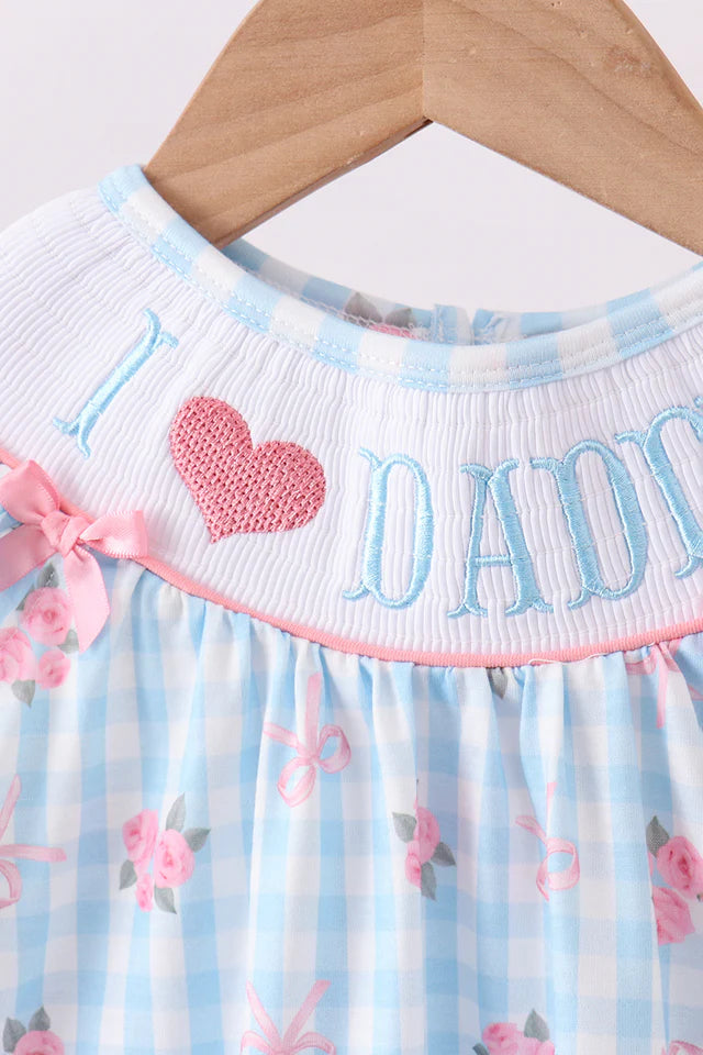 Celebrate the special bond between father and daughter with this charming two-piece set. The smocked top features "I love DADDY" text in soft blue floral gingham, while coordinating ruffled bloomers add playful dimension. Delicate smocking provides gentle texture and all-day comfort, making it perfect for daddy-daughter outings, family photos, or milestone celebrations. The breathable cotton-blend fabrics ensure little ones stay comfortable throughout the day. A heartwarming choice for expressing love in style.